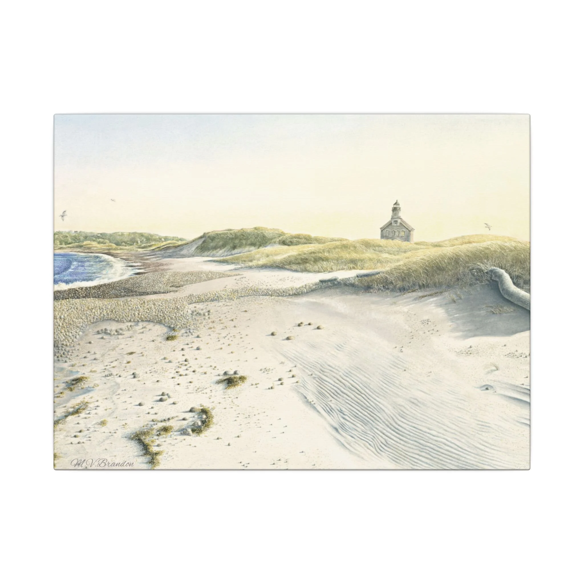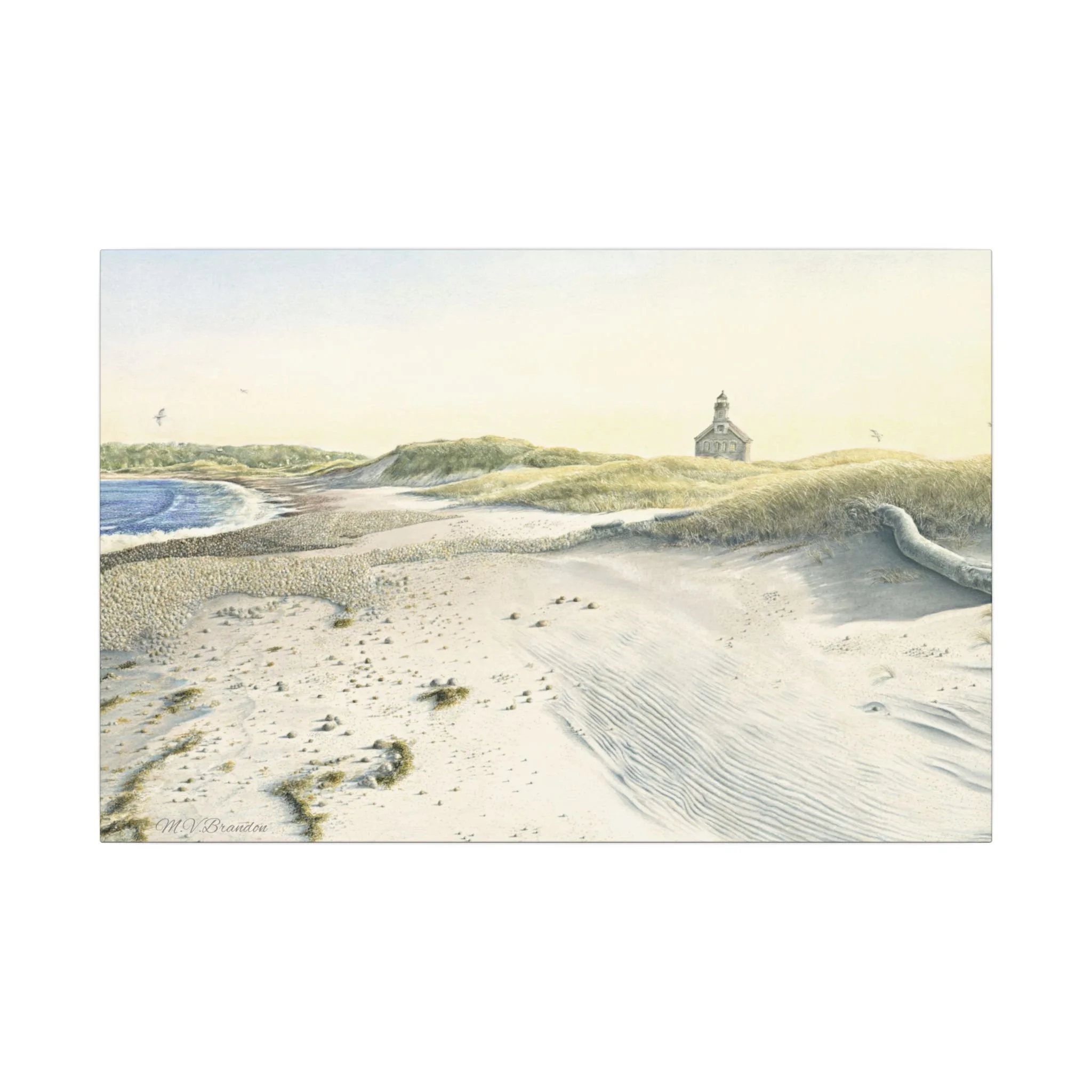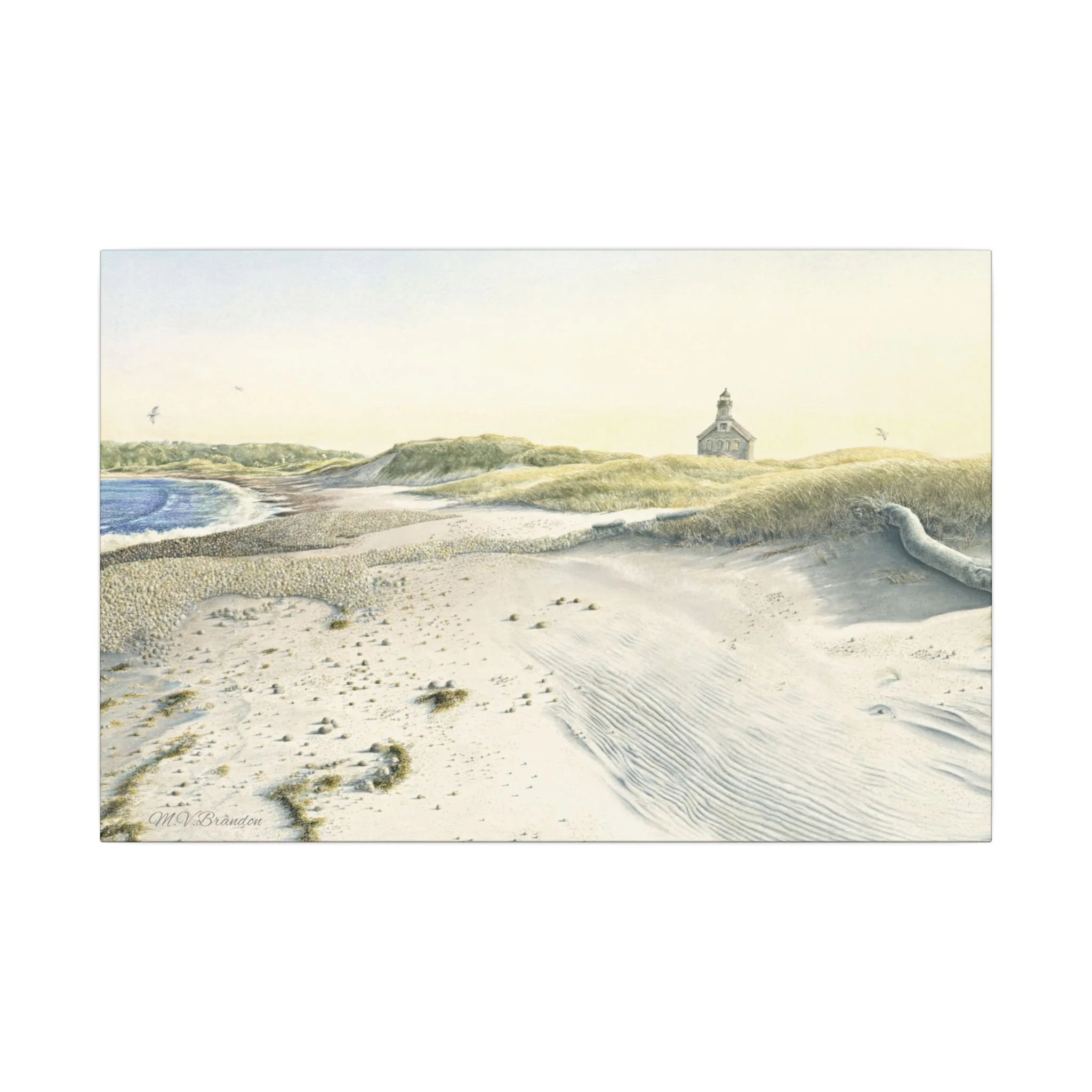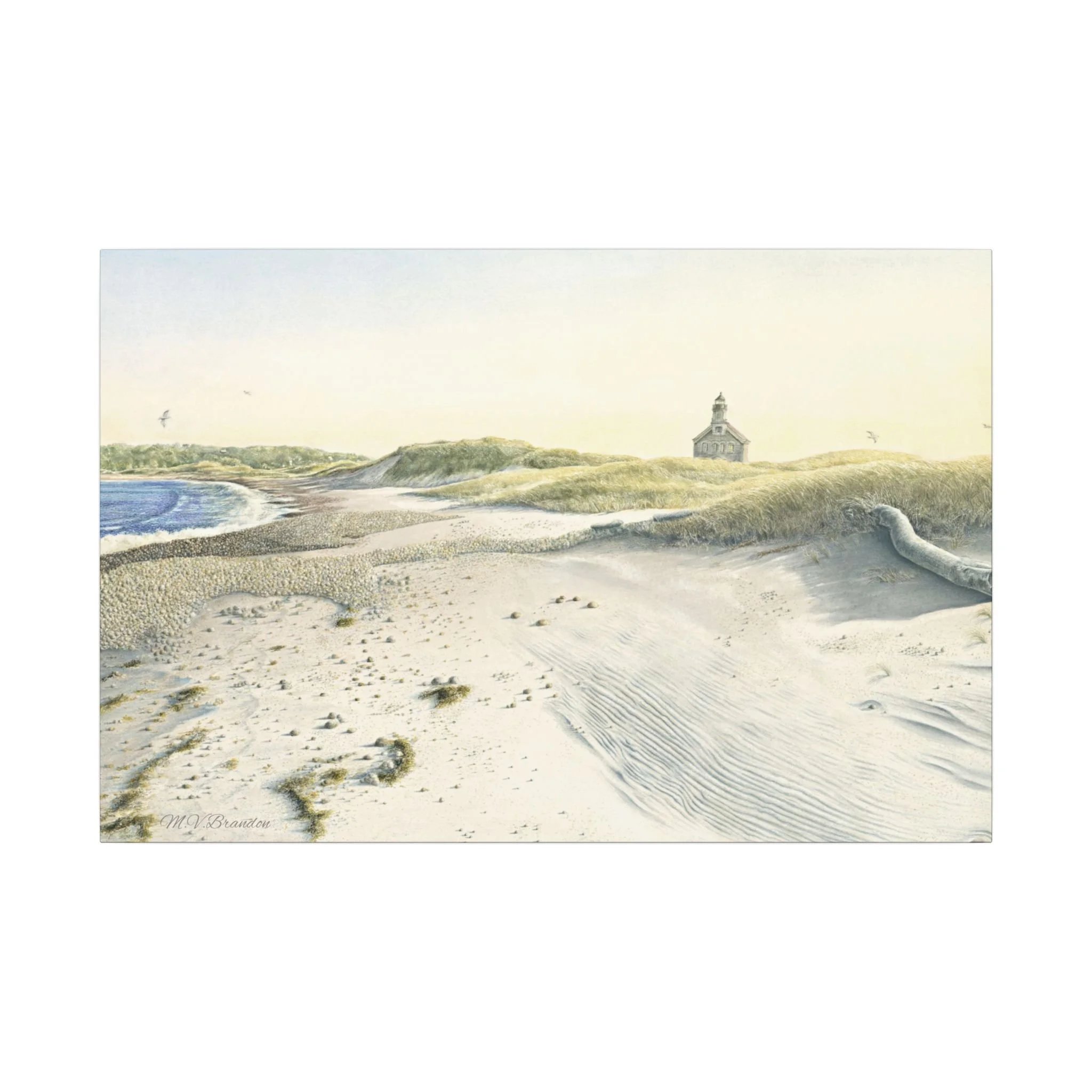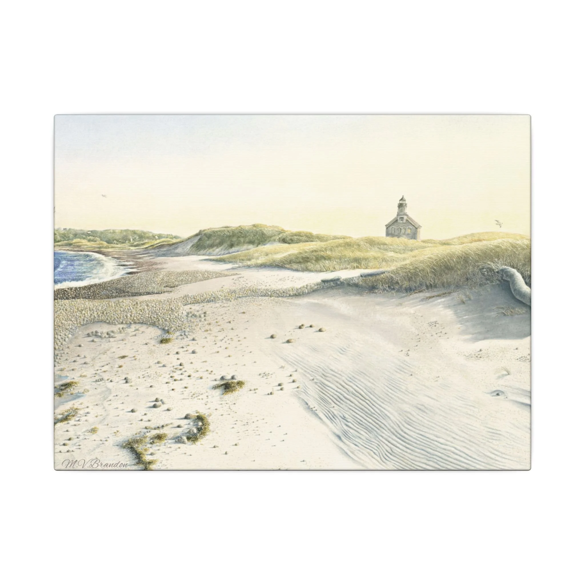 This stretched matte canvas brings the historic Block Island lighthouse into your room with the gentle wash of original watercolor. The textured, artist-grade cotton surface holds every brushstroke and soft gradient, so the scene reads like a quiet memory rather than a flat print. Stretched over a slim 0.75" wooden profile with a closed cardboard backing and patented solid support face, it arrives ready to hang—no framing or fuss. The natural pine stretcher and muted matte finish give the piece a lived-in coastal charm that pairs easily with weathered wood, linen, and sea-glass palettes. Whether it rests above a reading nook, anchors a gallery wall, or quiets an entryway, the lighthouse print evokes fog-light mornings, distant gull calls, and the steady calm of islandside life.