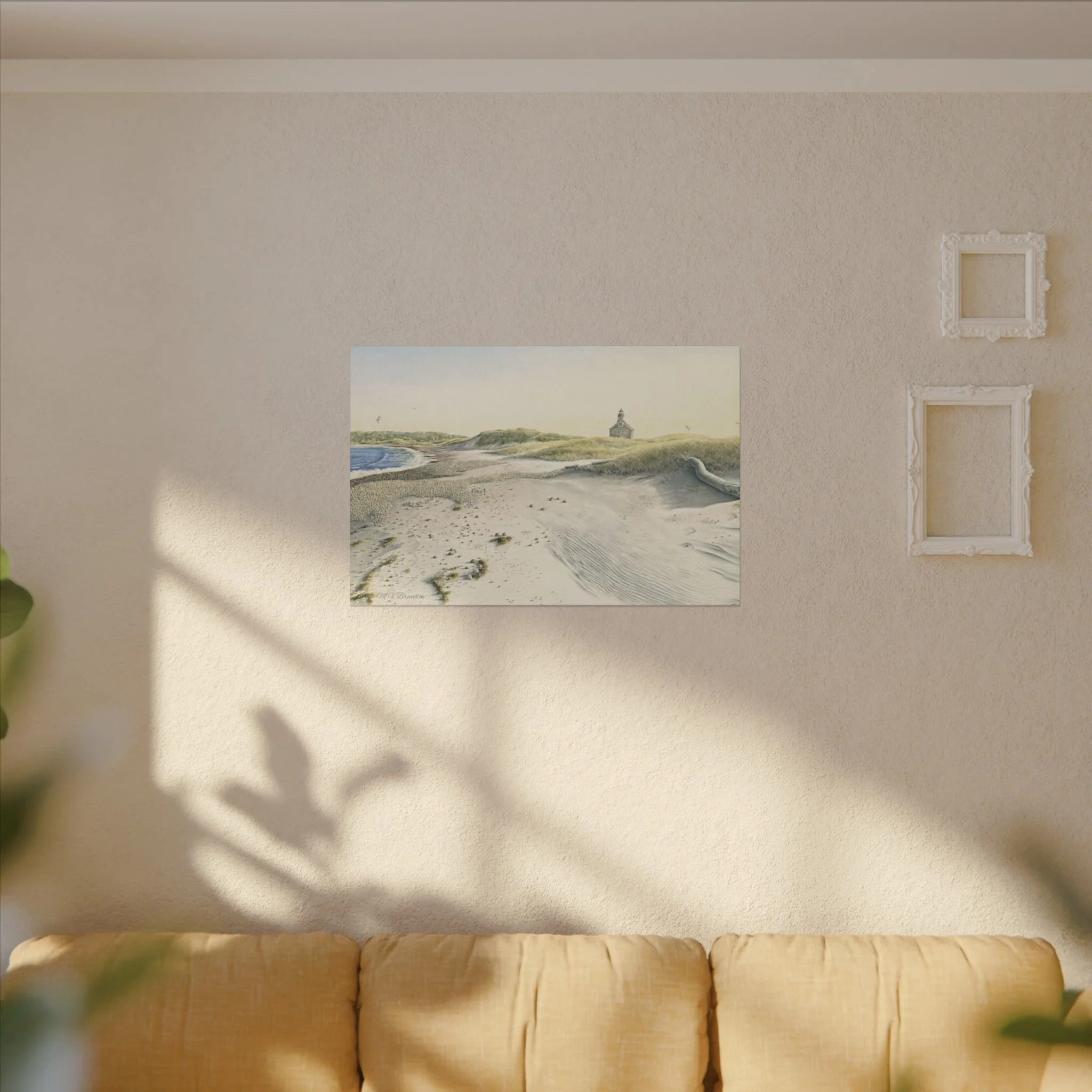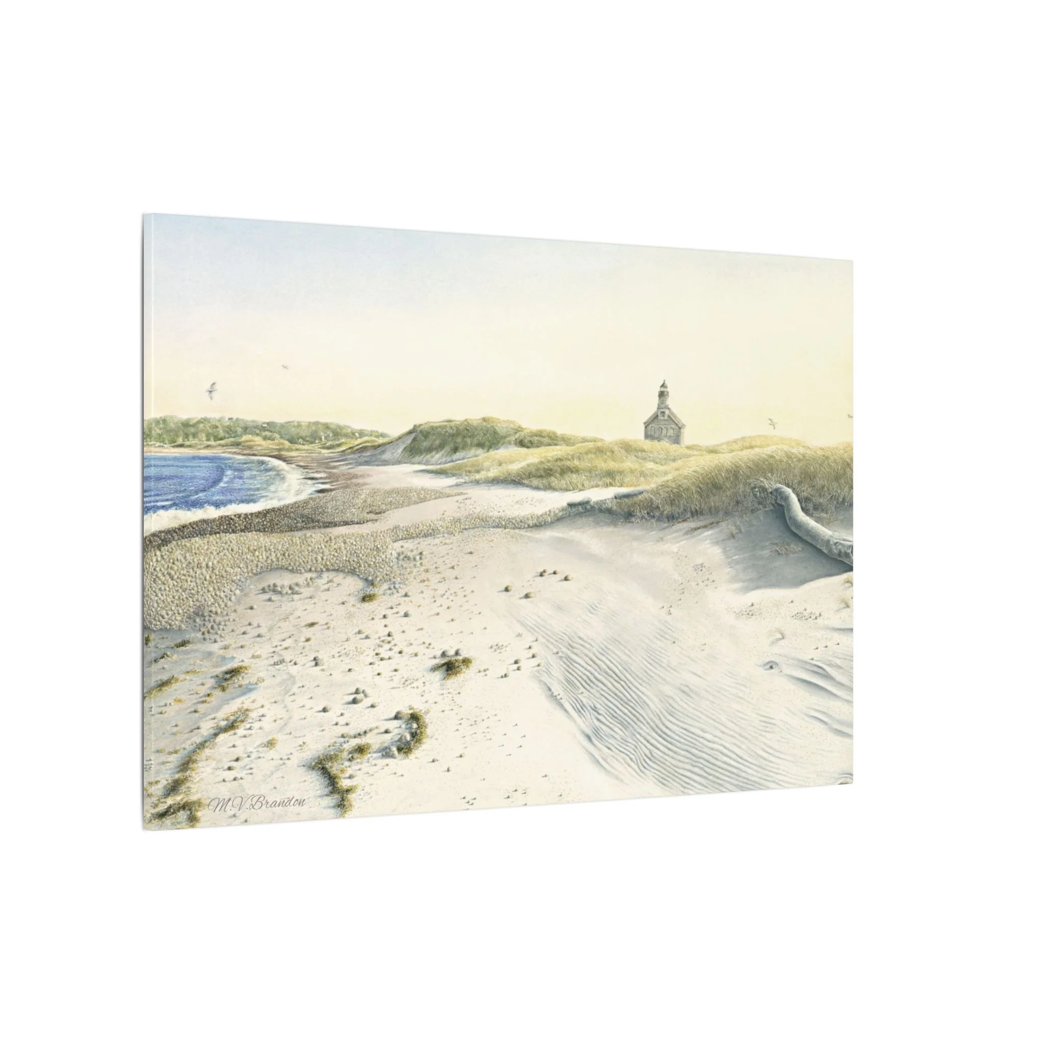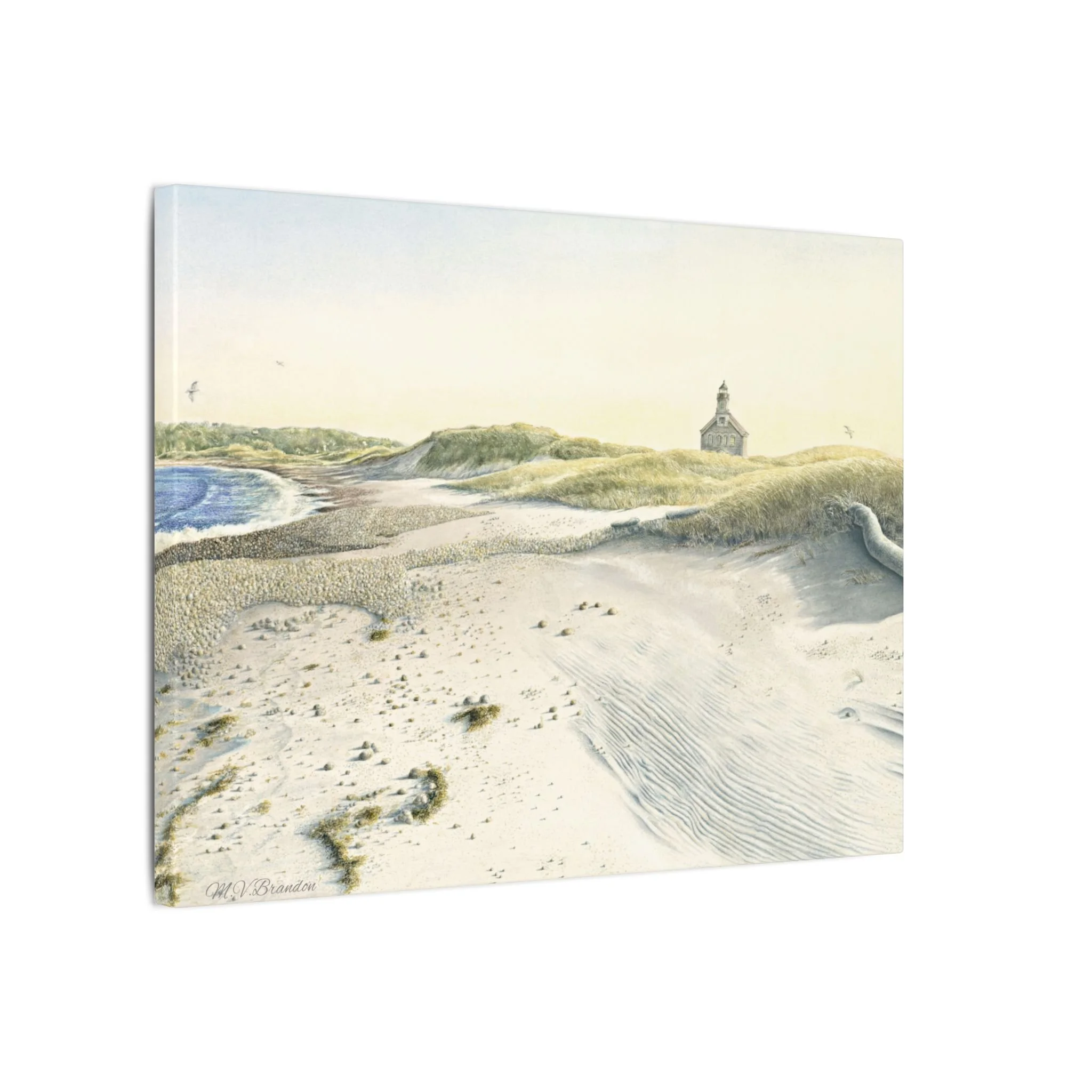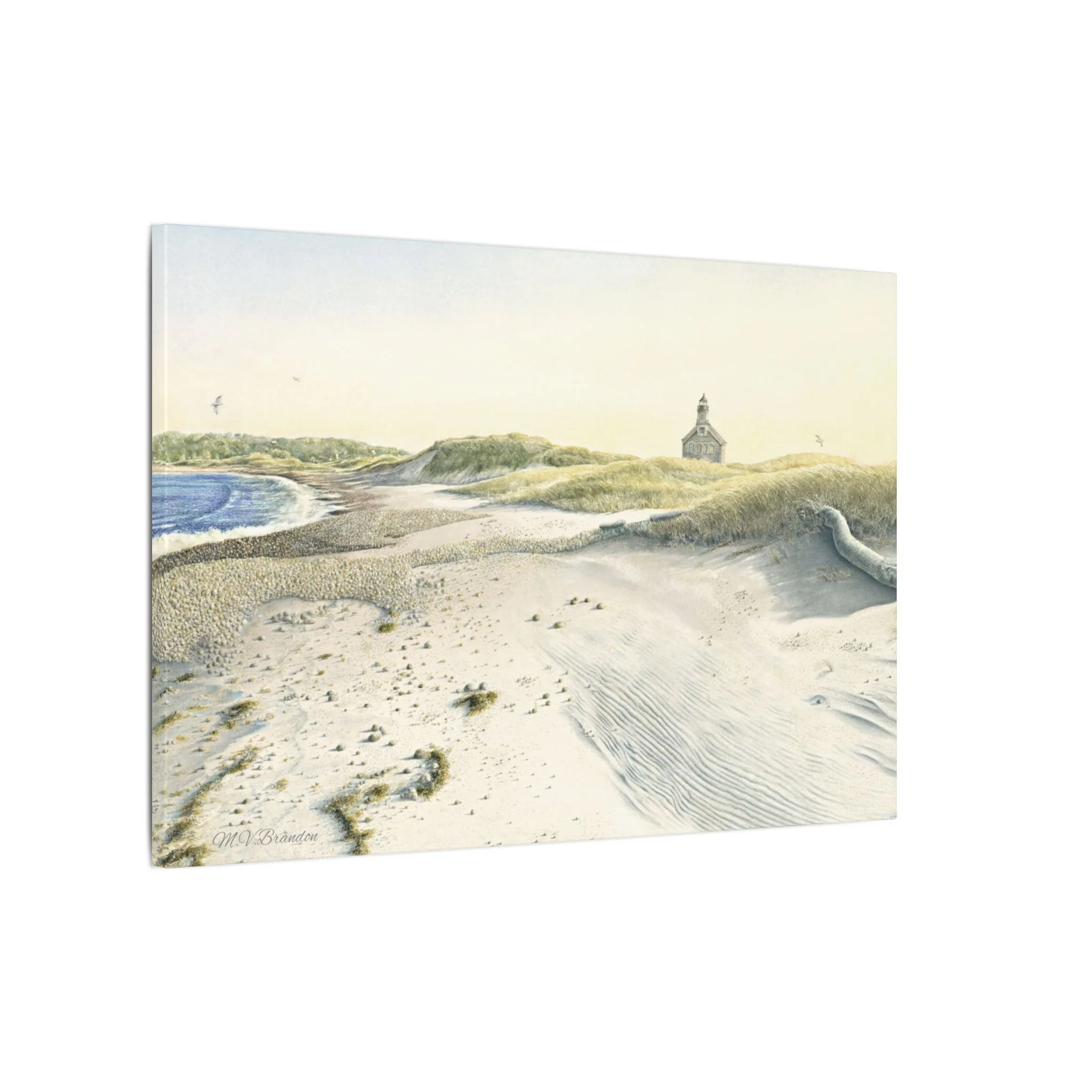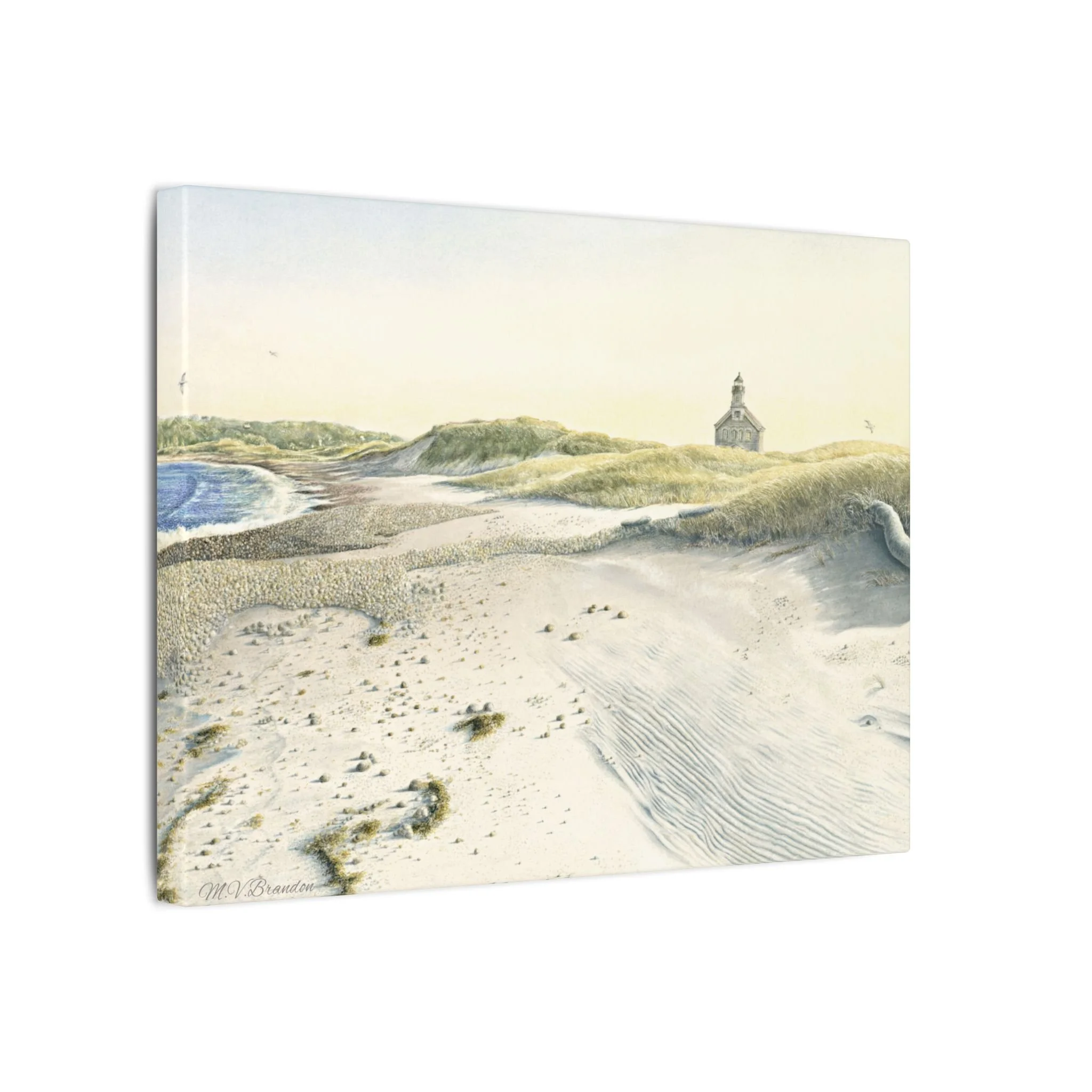 This stretched matte canvas brings the historic Block Island lighthouse into your room with the gentle wash of original watercolor. The textured, artist-grade cotton surface holds every brushstroke and soft gradient, so the scene reads like a quiet memory rather than a flat print. Stretched over a slim 0.75" wooden profile with a closed cardboard backing and patented solid support face, it arrives ready to hang—no framing or fuss. The natural pine stretcher and muted matte finish give the piece a lived-in coastal charm that pairs easily with weathered wood, linen, and sea-glass palettes. Whether it rests above a reading nook, anchors a gallery wall, or quiets an entryway, the lighthouse print evokes fog-light mornings, distant gull calls, and the steady calm of islandside life.