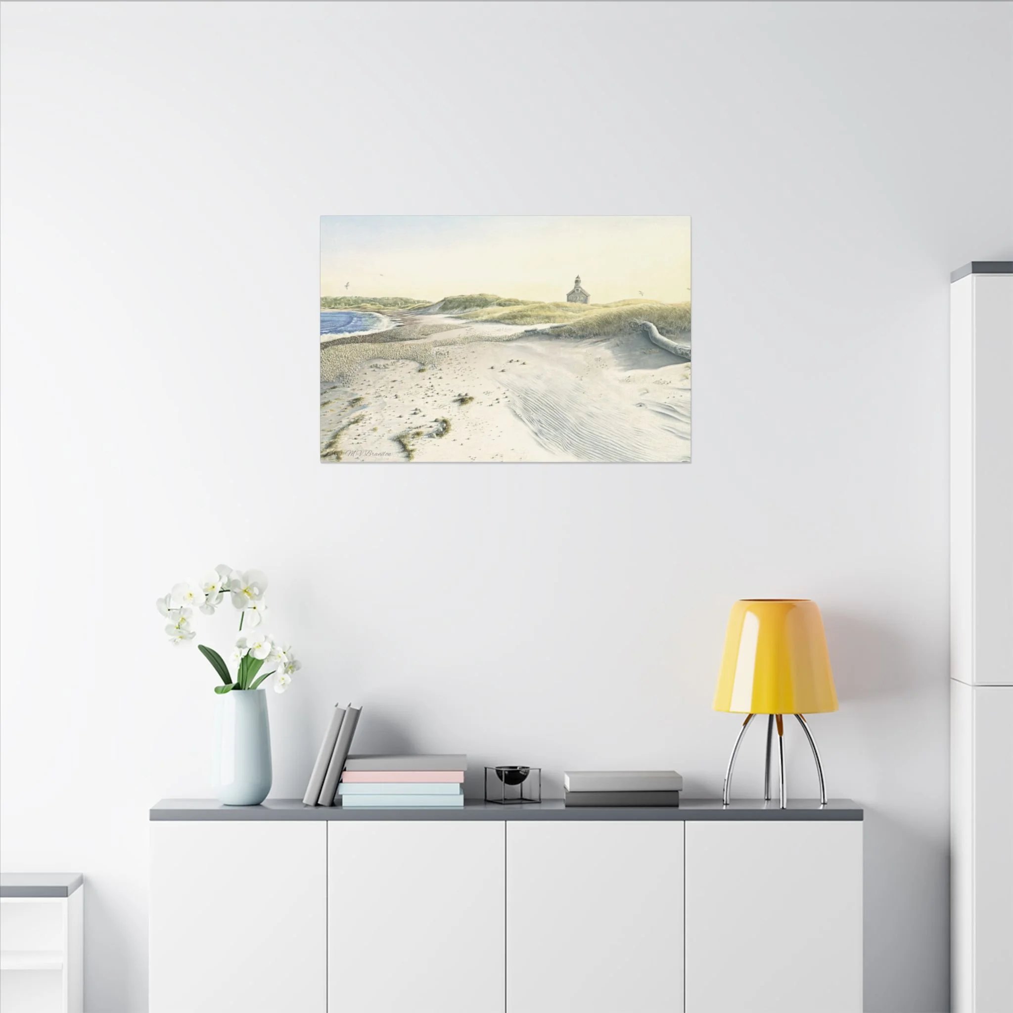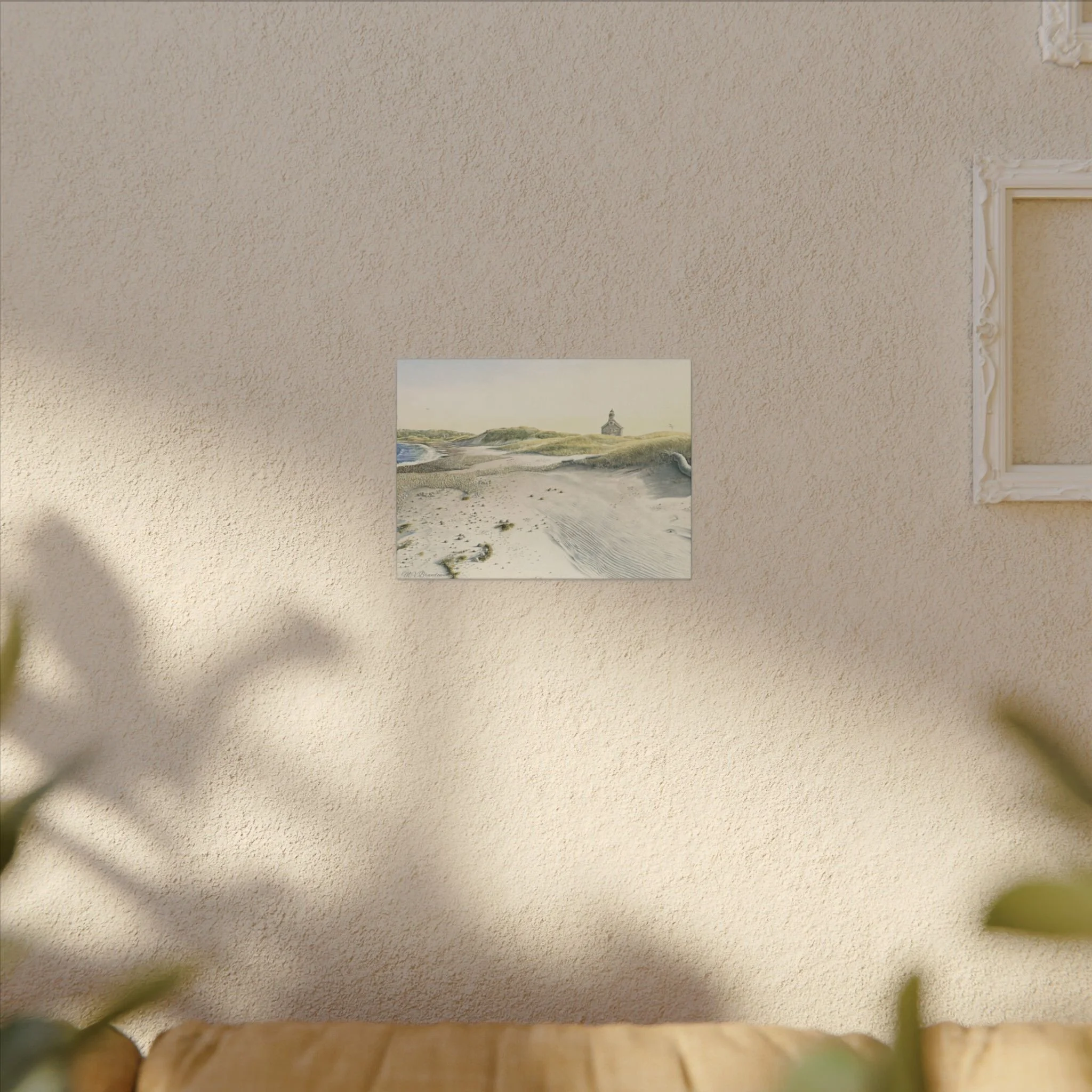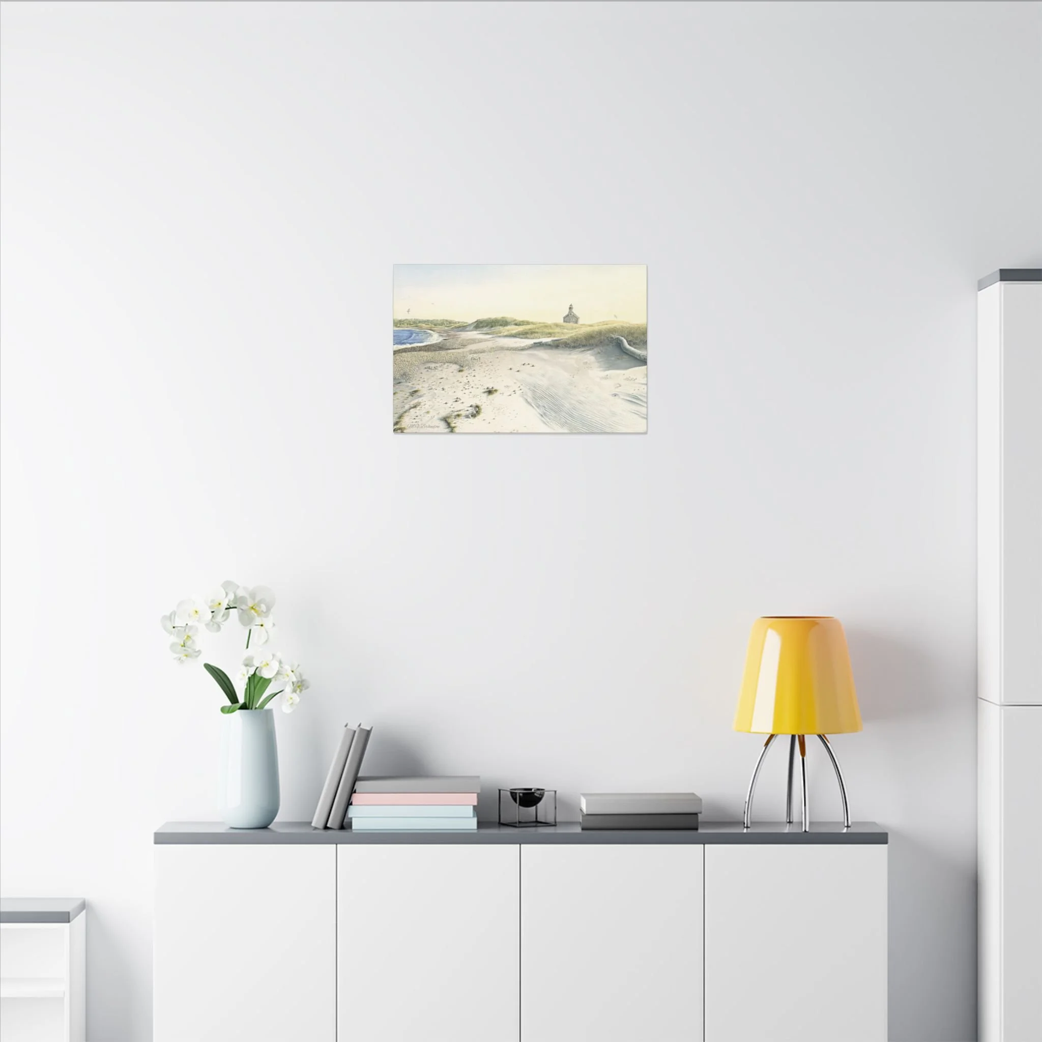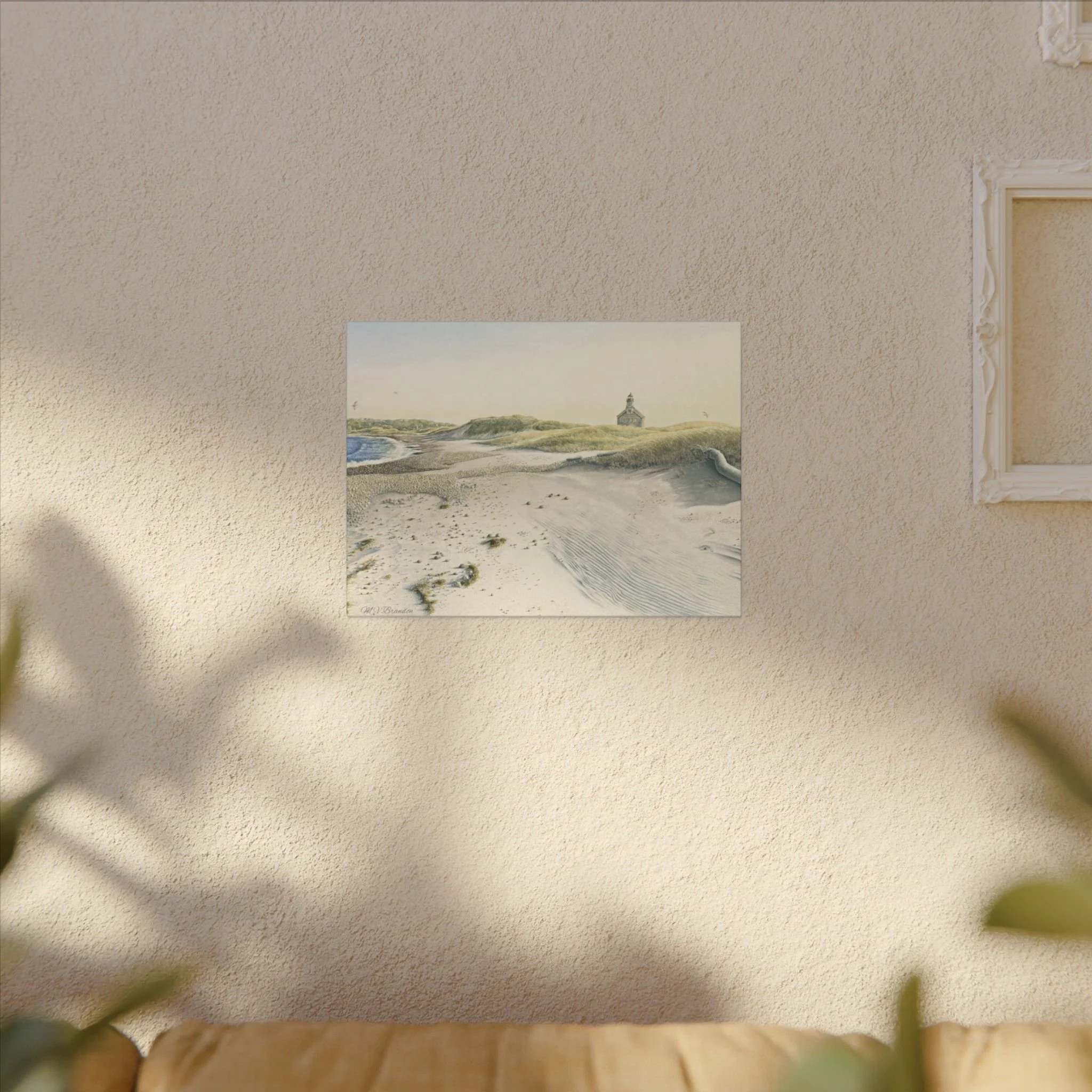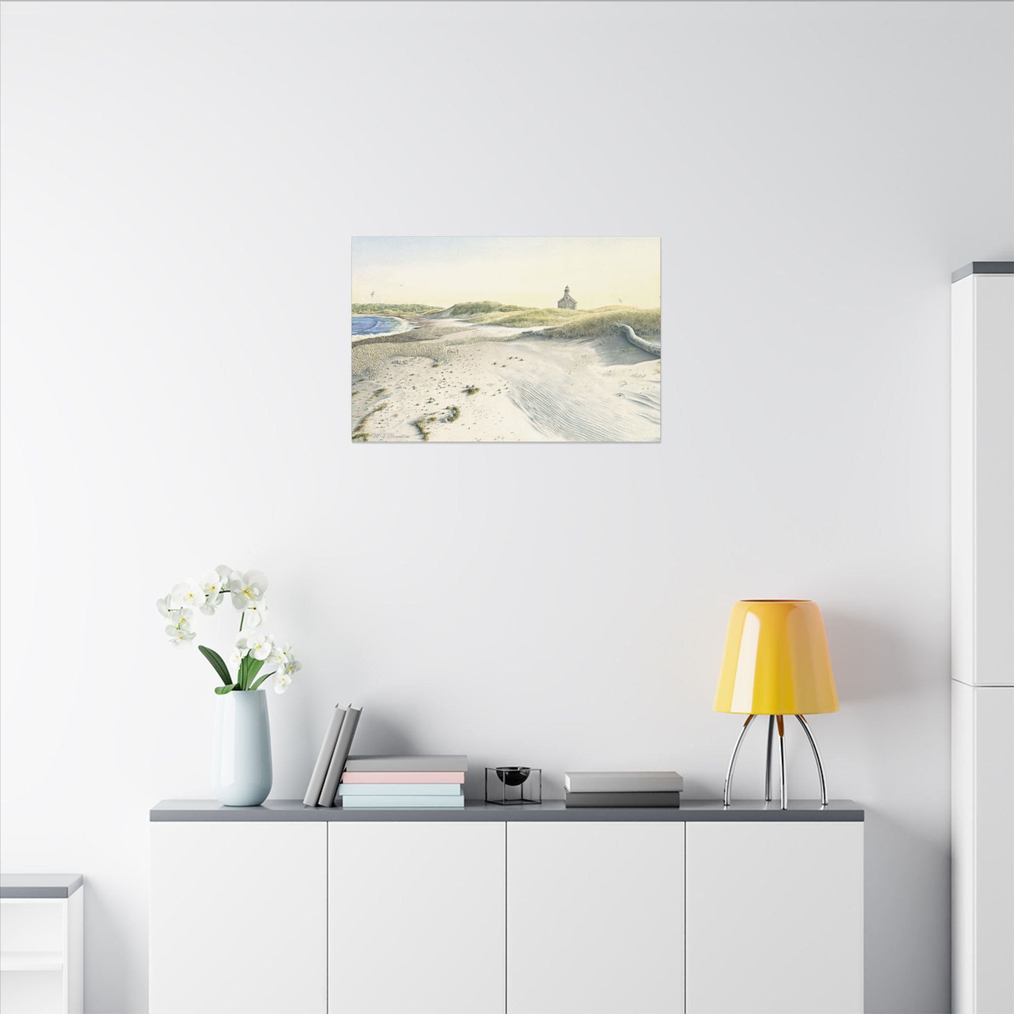 This stretched matte canvas brings the historic Block Island lighthouse into your room with the gentle wash of original watercolor. The textured, artist-grade cotton surface holds every brushstroke and soft gradient, so the scene reads like a quiet memory rather than a flat print. Stretched over a slim 0.75" wooden profile with a closed cardboard backing and patented solid support face, it arrives ready to hang—no framing or fuss. The natural pine stretcher and muted matte finish give the piece a lived-in coastal charm that pairs easily with weathered wood, linen, and sea-glass palettes. Whether it rests above a reading nook, anchors a gallery wall, or quiets an entryway, the lighthouse print evokes fog-light mornings, distant gull calls, and the steady calm of islandside life.
