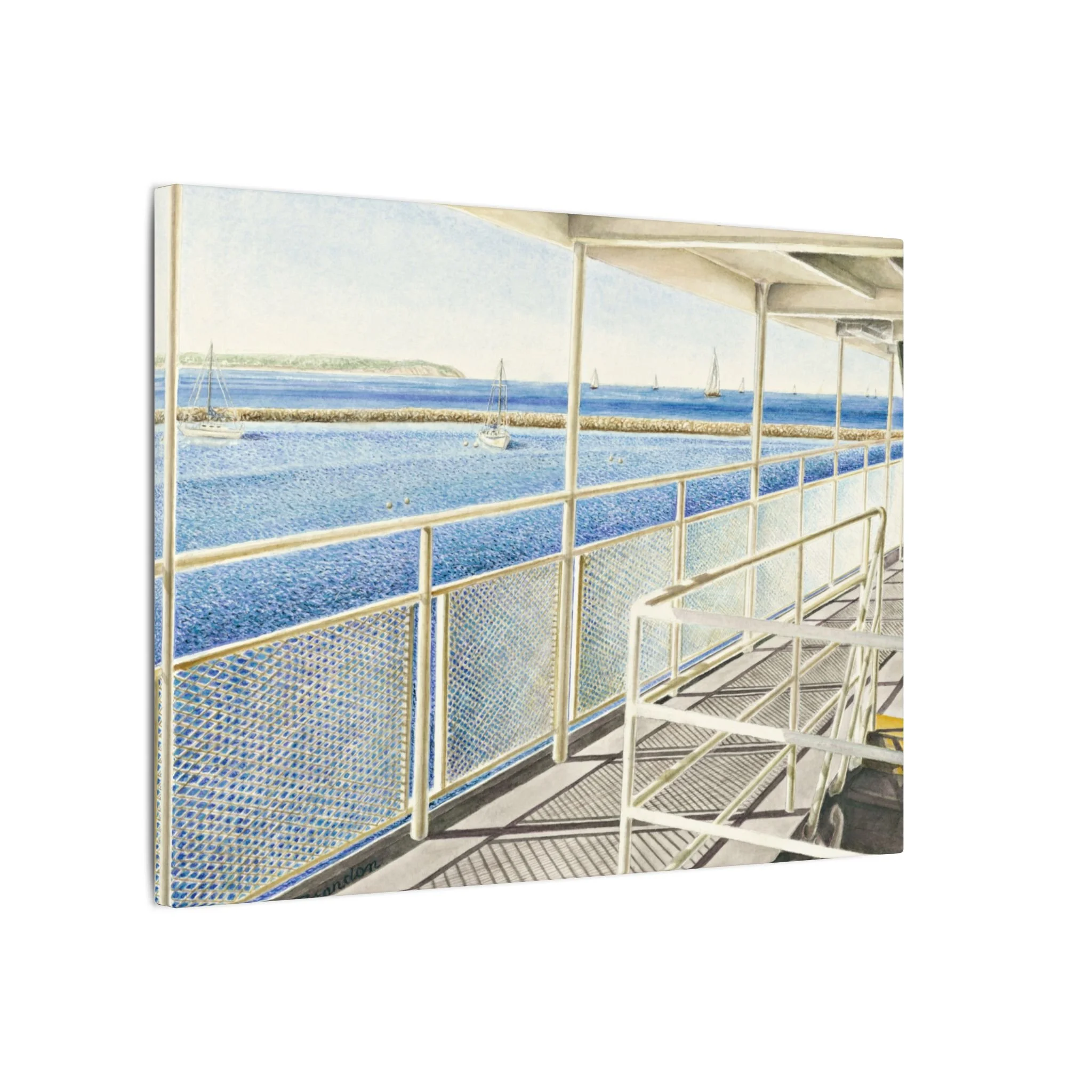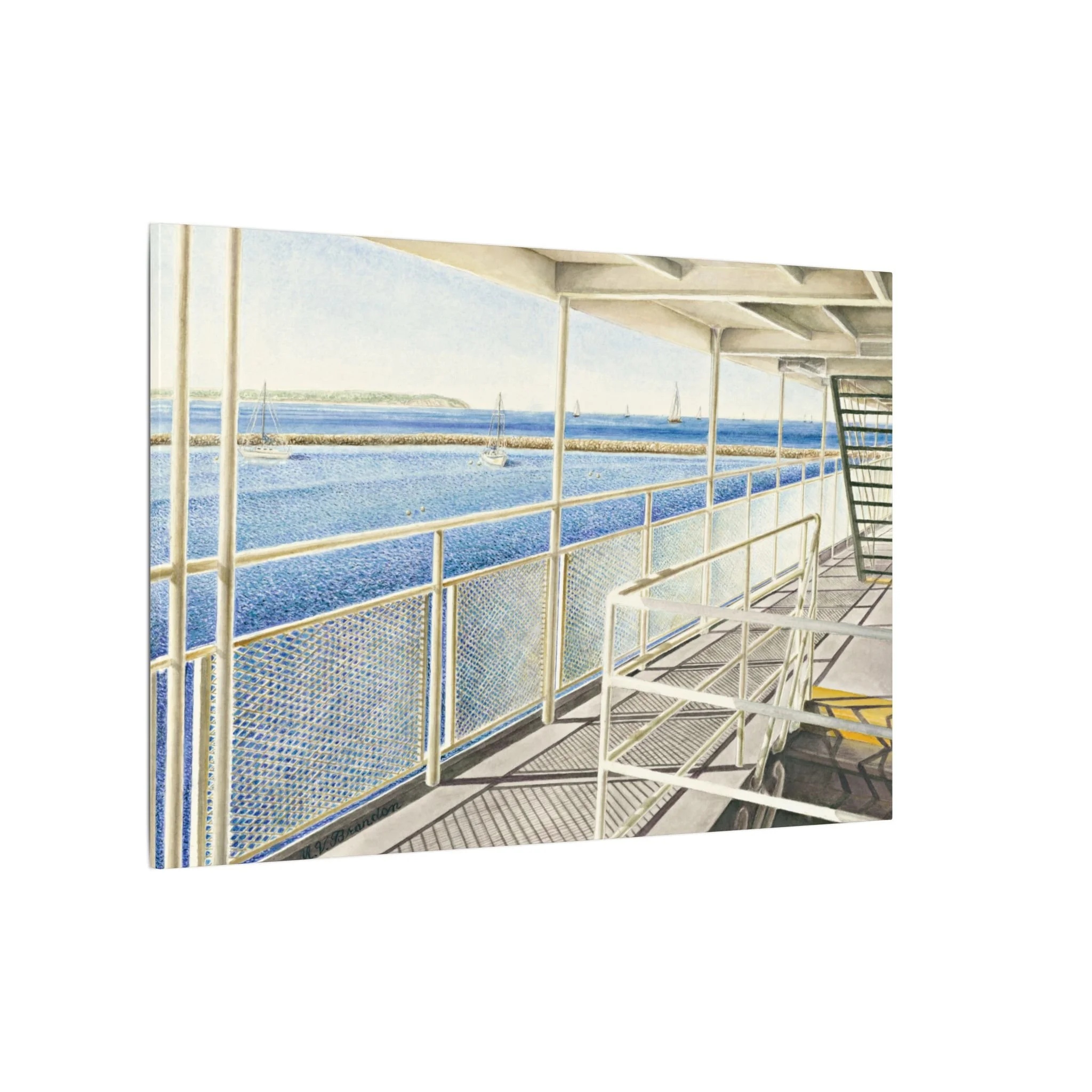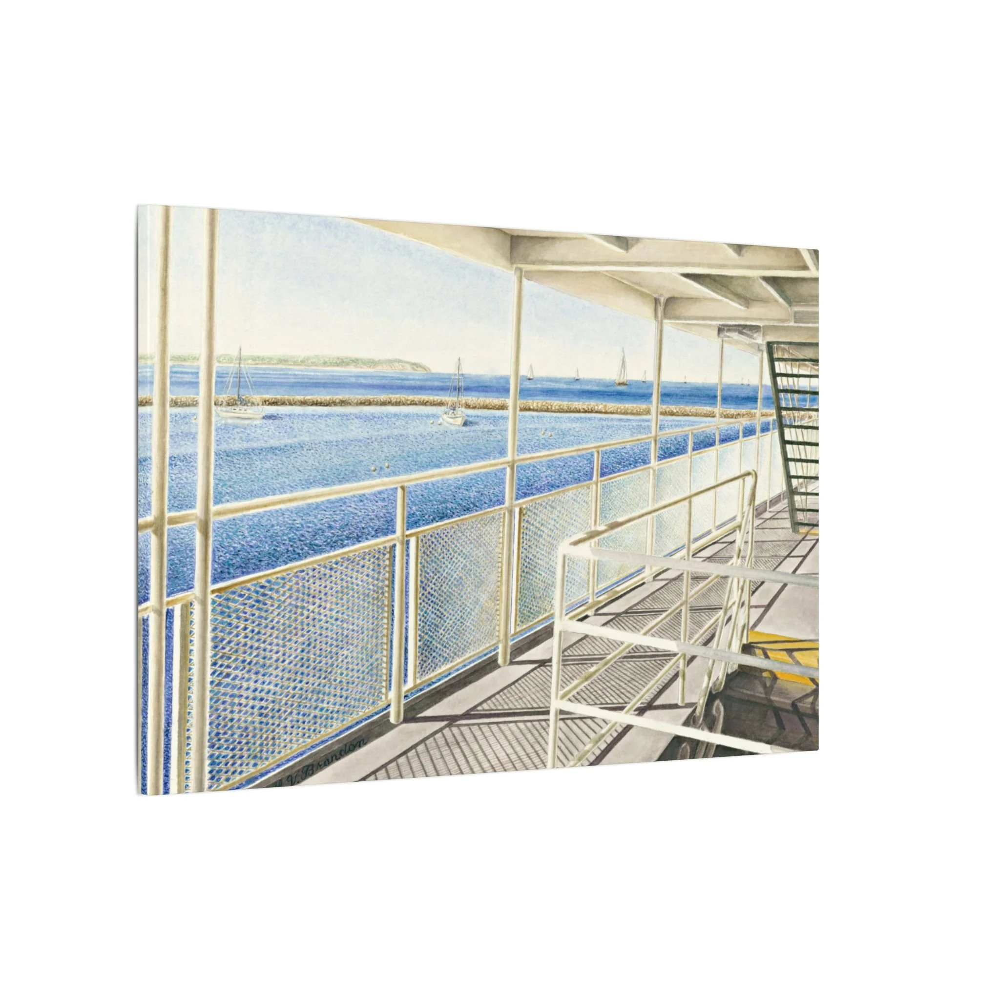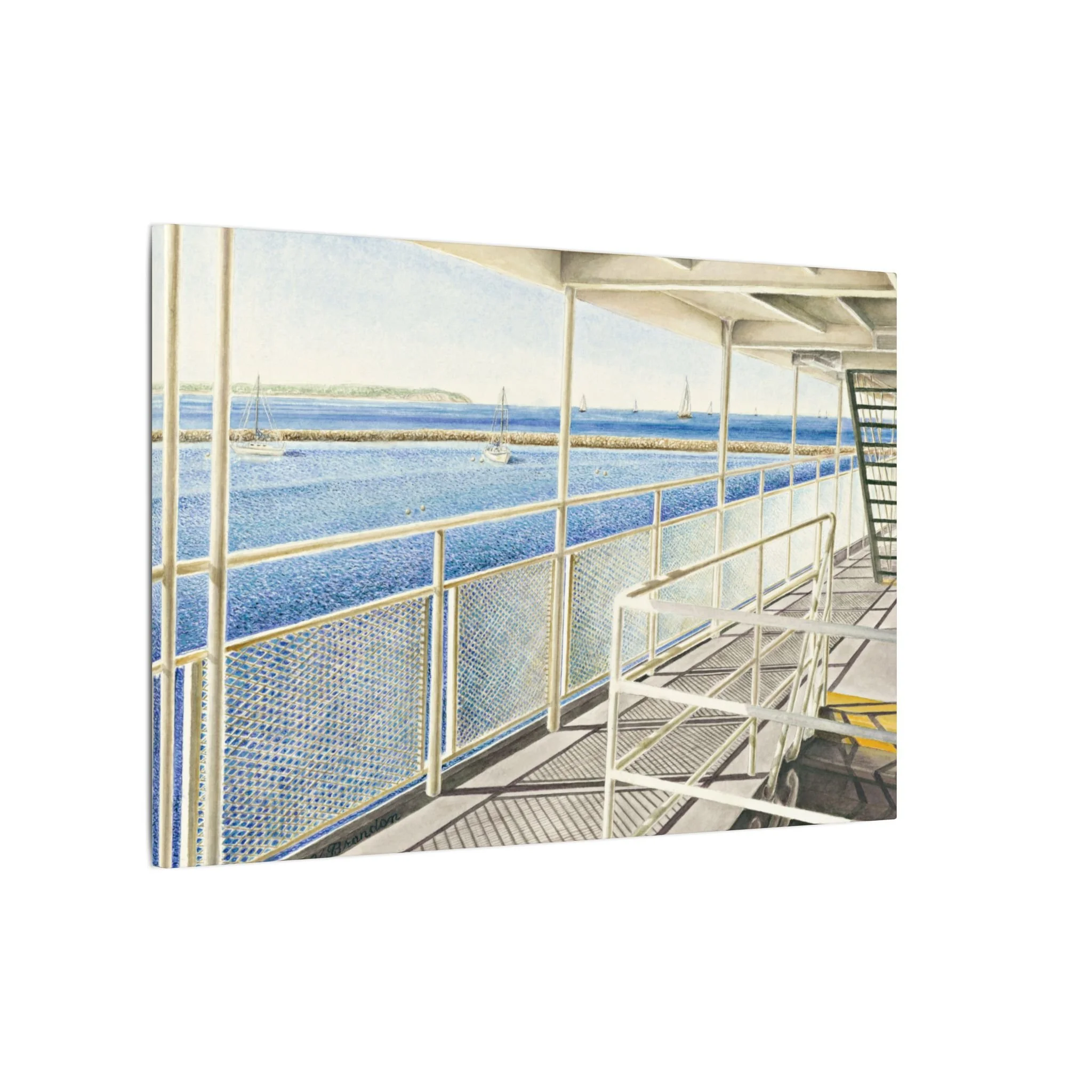 Step onto the ferry deck and breathe in the salt air. This stretched matte canvas reproduces Murray Brandon’s watercolor of Old Harbor—the moment island time begins. Soft washes of blue and white ripple across a textured, cotton substrate that keeps the watercolor’s delicate details alive. The solid support face keeps the canvas taut and gallery-ready, while archival giclée inks preserve the painting’s subtle contrasts so the scene keeps its glow for years. It hangs confidently thanks to discreet rubber pads that protect your wall and steady the piece. Hang it in a coastal entryway, a sunlit living room, or a study where travel memories collect; it quietly calls back to ferry decks, gull cries, and the hush that arrives when you first see Block Island’s shore.