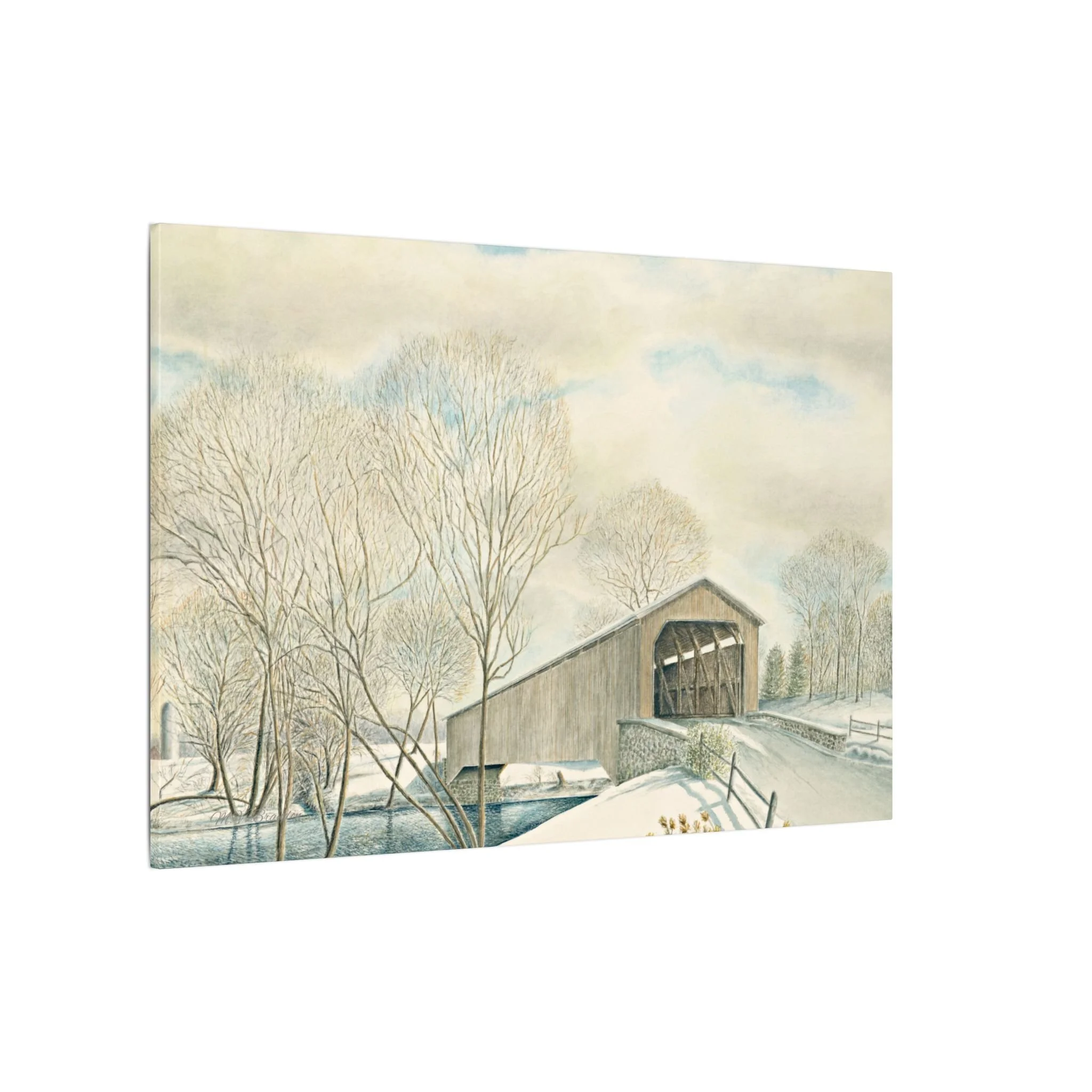 This matte stretched canvas brings Hunsecker's Mill Bridge to your wall with quiet, textured elegance. Murray Brandon’s original watercolor translates beautifully onto artist-grade, finely textured cotton for soft washes and delicate detail. The slim 0.75" profile and built-in solid support face let you hang the piece straight from the box — no framing or fumbling required. Warm, slightly faded hues and subtle paper-like grain invite slow looks and calm conversation. It settles into a cozy reading nook, over a mantel in a Lancaster-inspired farmhouse, or above a desk as a daily reminder of local history and gentle landscapes. The backed stretcher and corner rubber feet keep the piece steady and flush against the wall so the scene reads as intended, every time you pass by.